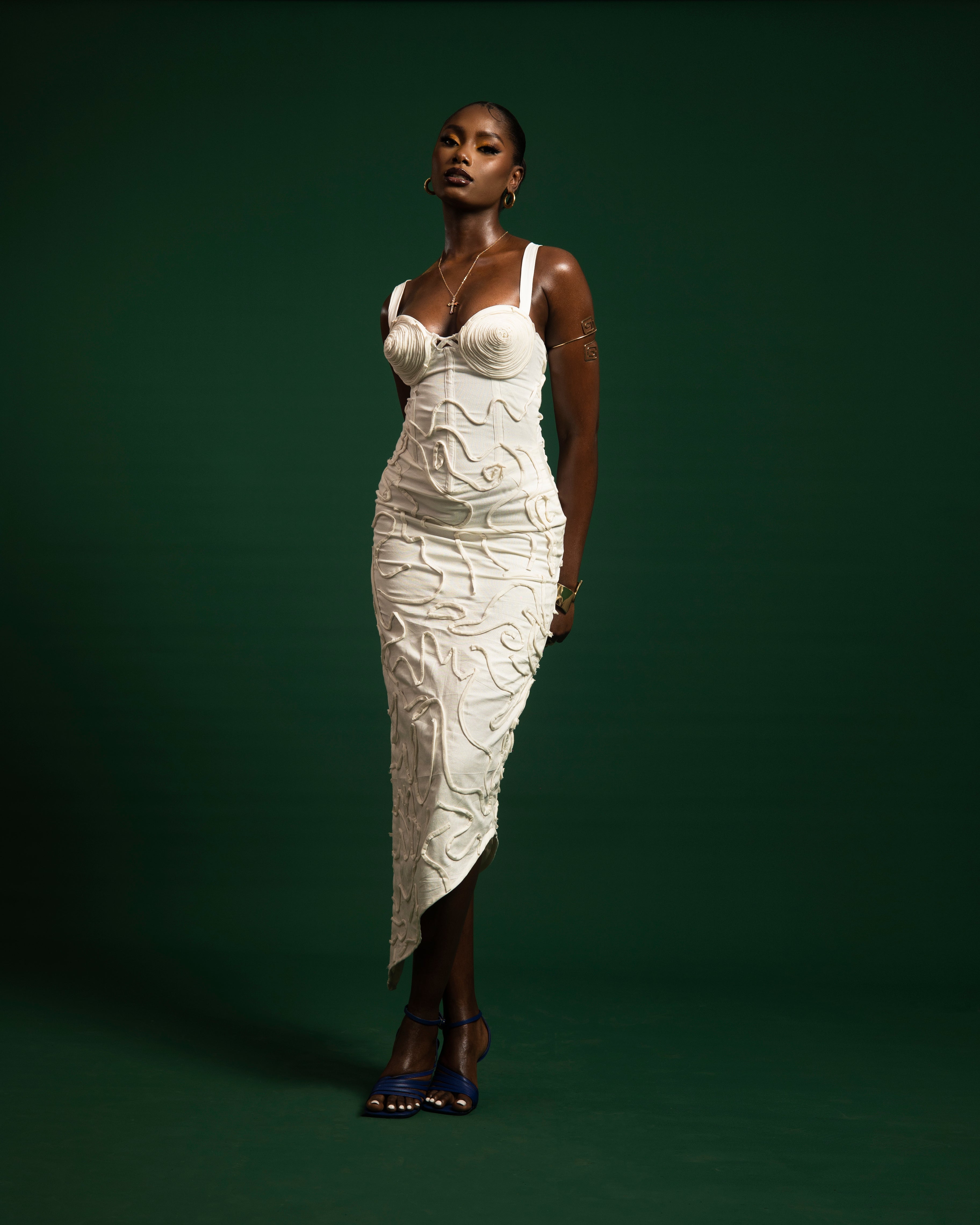 The sculptural linen dress is handmade with cursive lines that were crafted with you in mind.