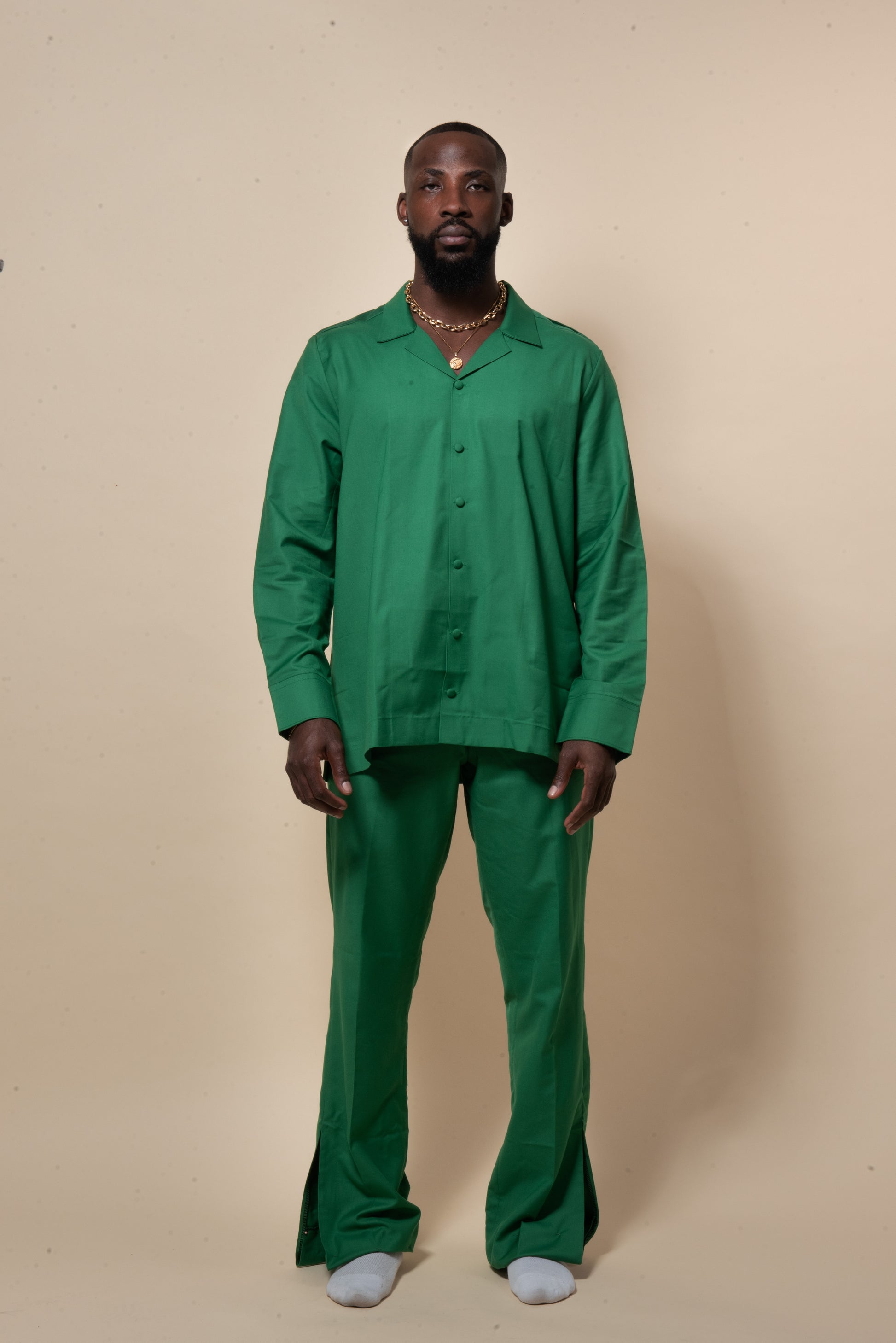 This GREEN ARMADILLO mens set is the perfect choice for a bold statement. Its pleated design and hand crafted features make it unique and stylish. The green color provides an extra pop, making it an eye-catching piece of clothing.