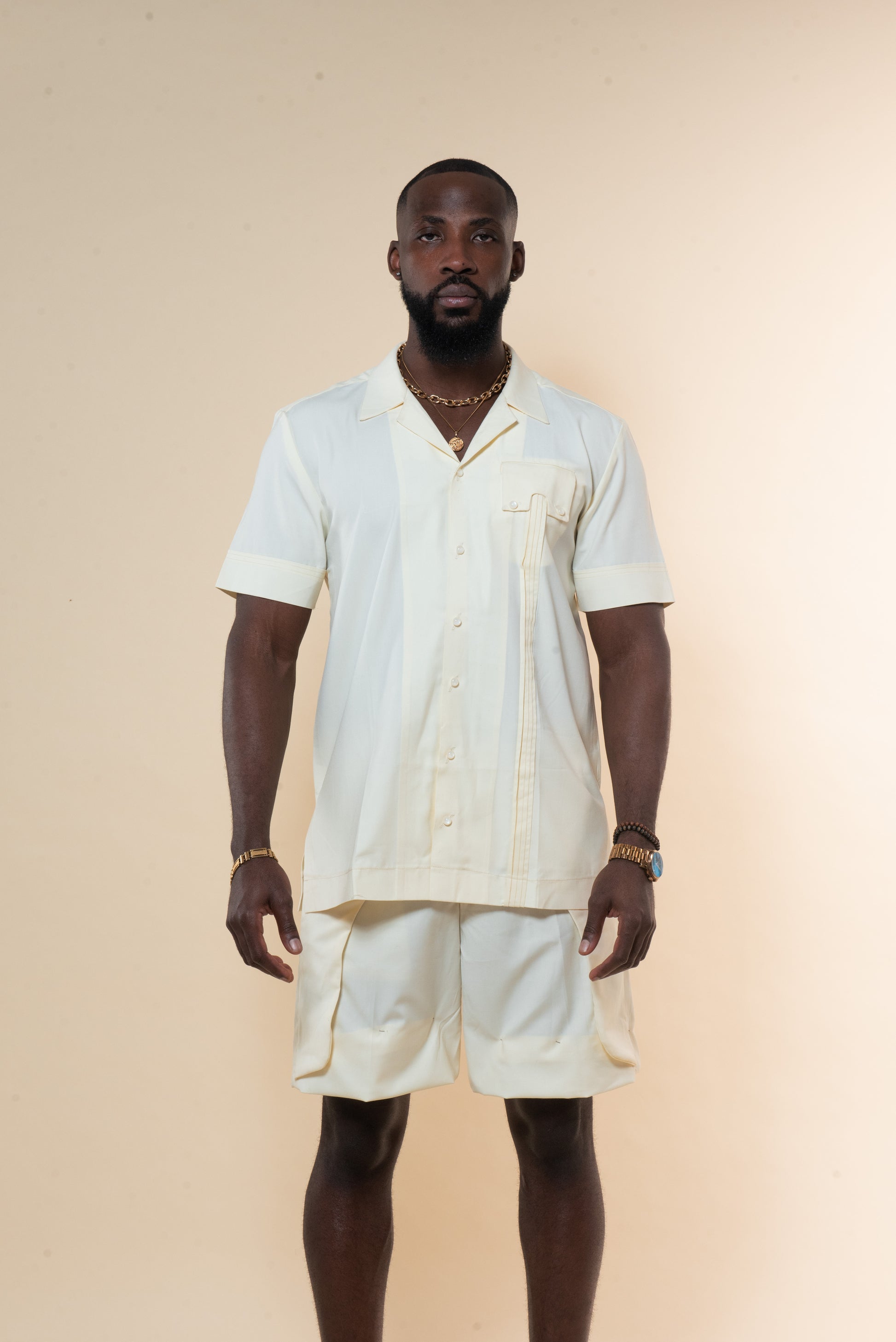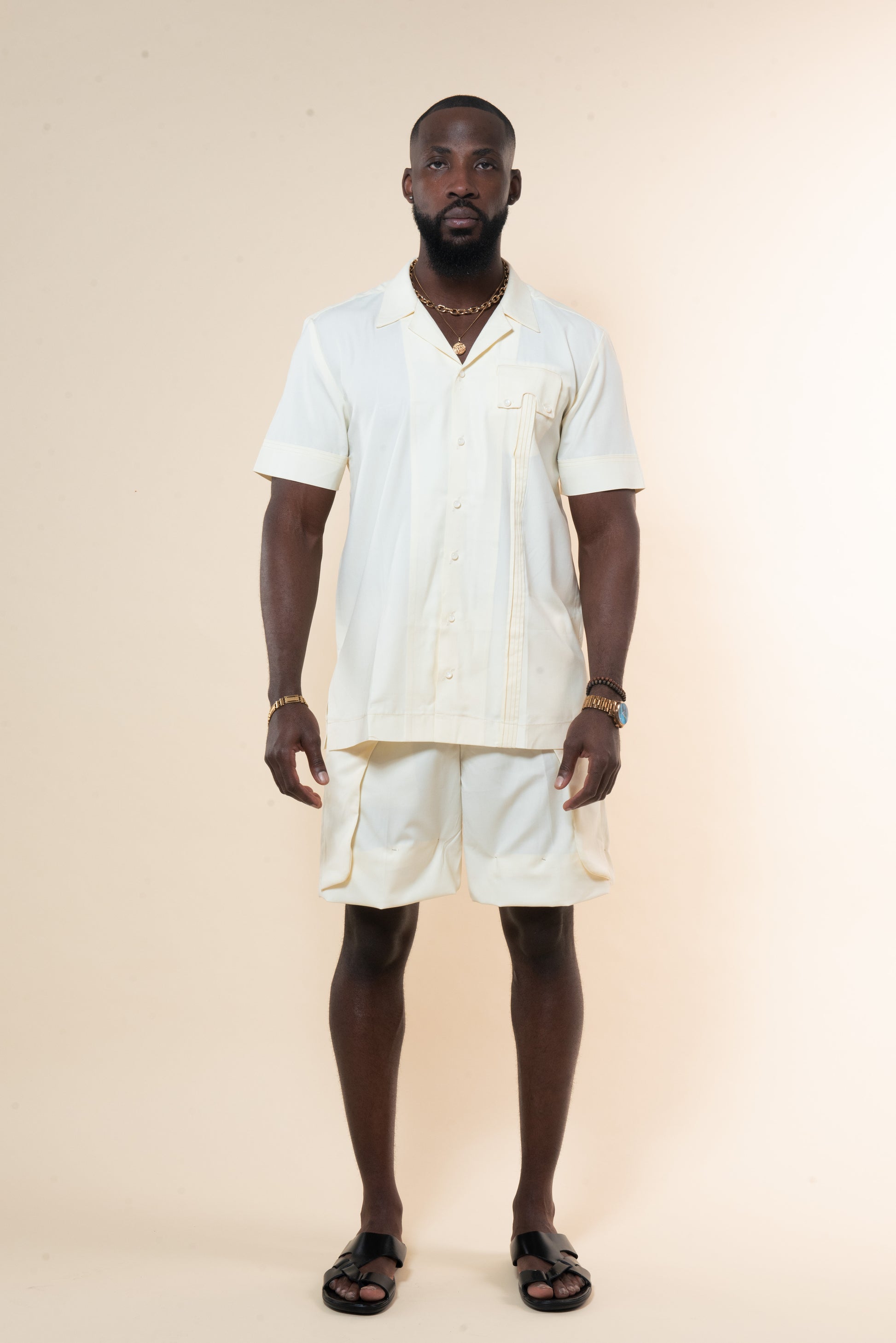 Experience luxury and relaxation this vacation season with the CRÈME shorts set. Crafted with vertical pleats that flow down a horseshoe shaped pocket, this sleek ensemble is the perfect way to indulge and enjoy a tropical getaway in style. Its saddle detail layer helps lend a dynamic silhouette and unbeatable elegance.