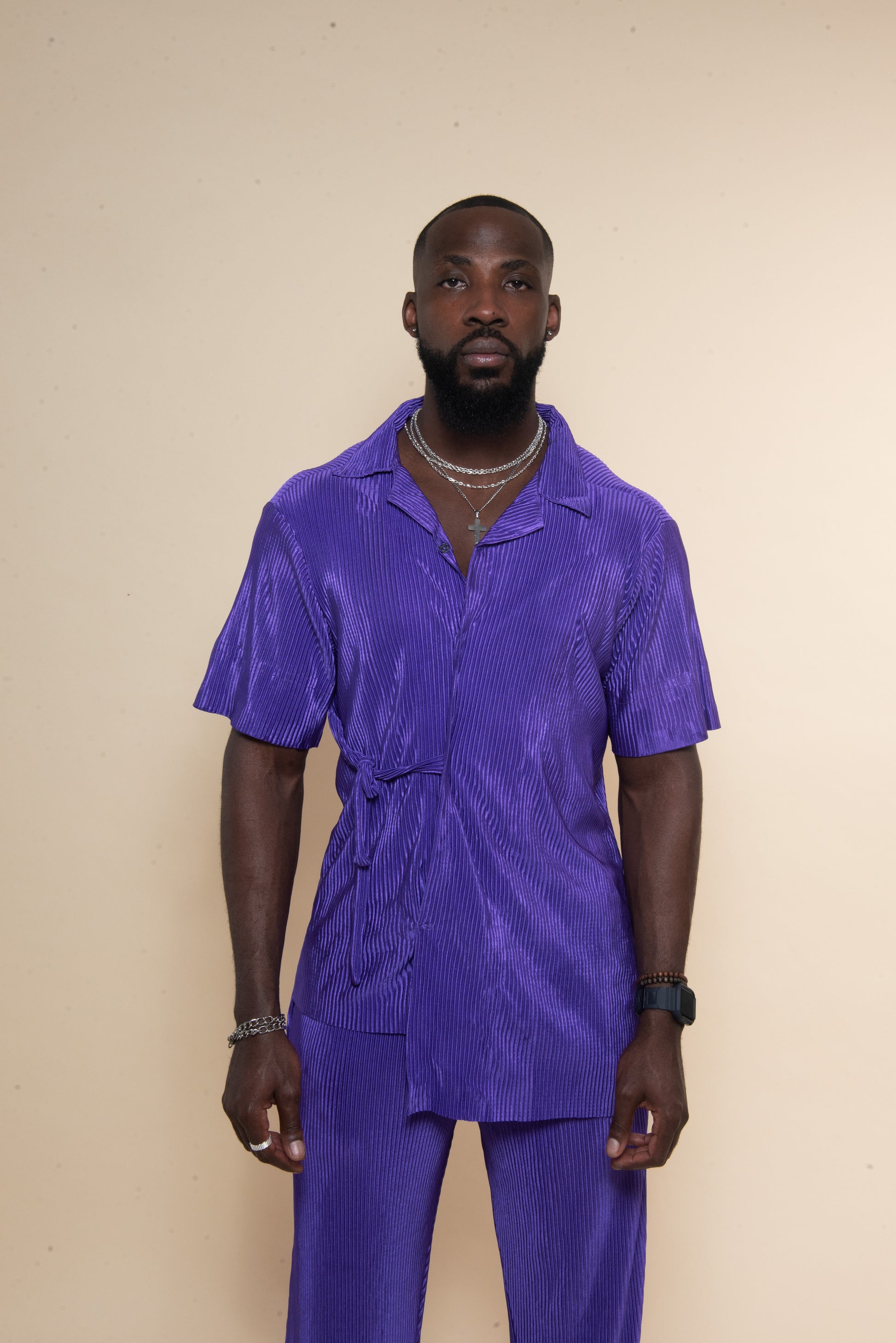 Elevate your wardrobe with this stylish and comfortable Purple 'PLEASE' set. Crafted with a kimono-inspired silhouette and featuring a pleated pant, this luxurious two-piece is destined to become one of your favourite ensembles. Perfect for the modern person with a sophisticated eye for style